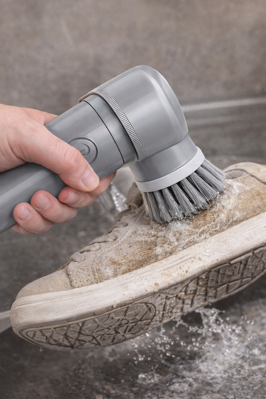 - Multiple brush heads — one tool for kitchen, bathroom, shoes & more